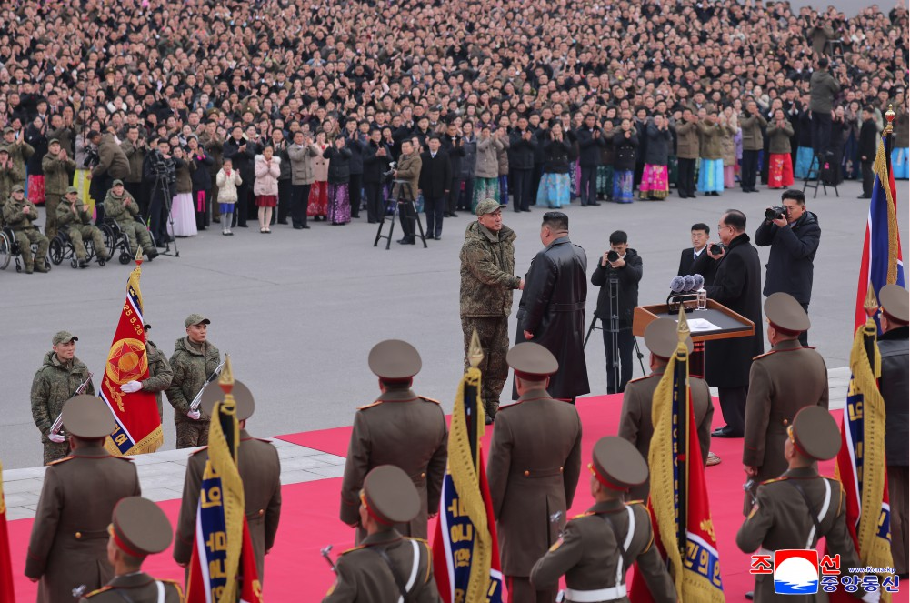 Глава КНДР Ким Чен Ын приветствовал солдат и офицеров лично, высоко оценив их и «массовый героизм» при выполнении приказов правящей Трудовой партии Кореи в ходе 120-дневной зарубежной командировки в Россию.