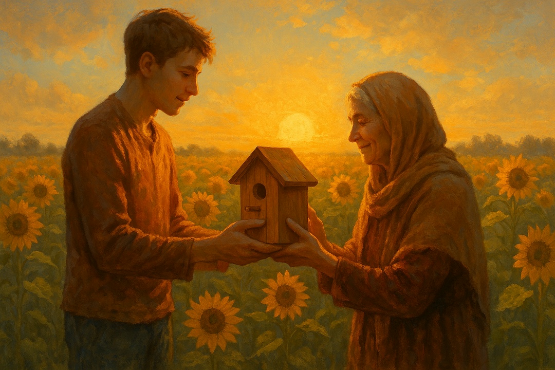 И картинка зачётная, - юноша дарит бабушке скворечник в поле, среди подсолнухов :)))