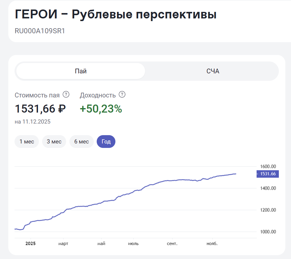 На этот раз читатели обратили внимание на ОПИФ «Рублёвые перспективы», предлагаемый на маркетплейсе «Финуслуги», который принёс 50,23% за текущий год.