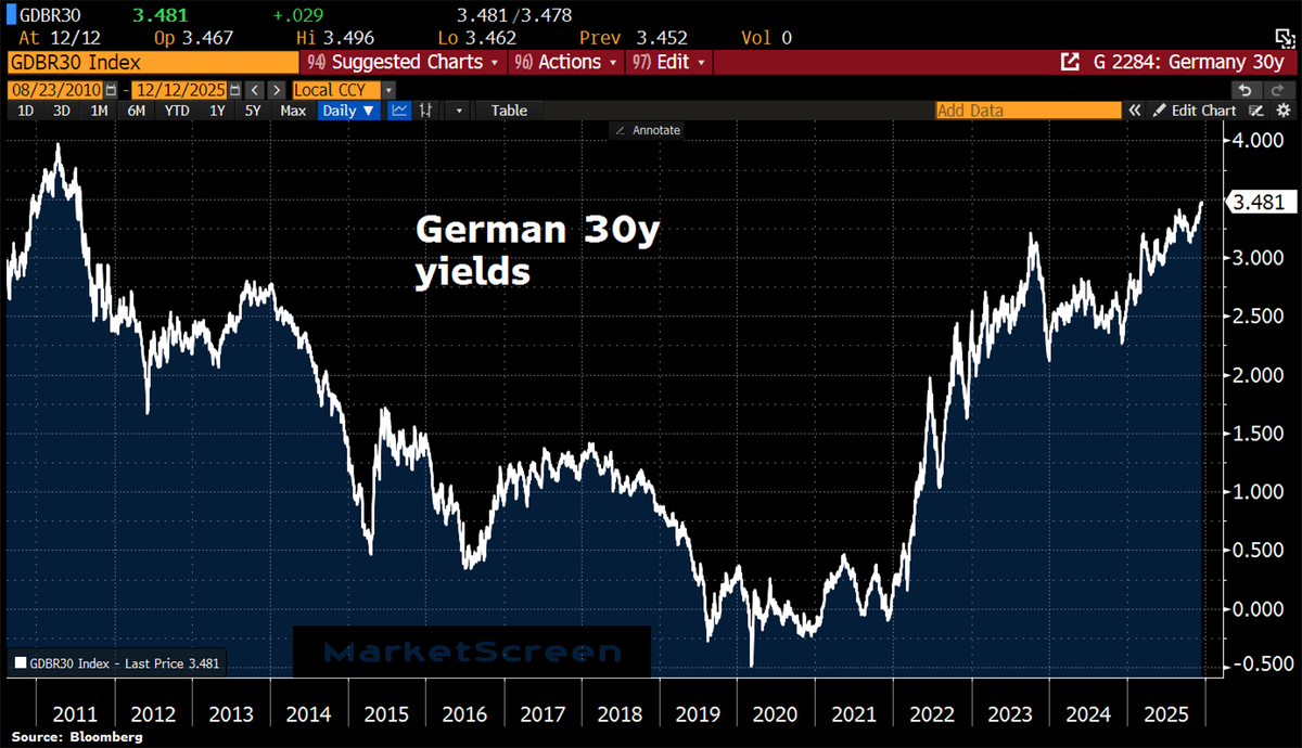 А в Германии продолжается рост доходностей государственных облигаций. 30-летние бумаги подбираются к 3,5%. Такого не было с 2011 года. Наверное, всё это потому, что с экономика Германии чувствует себя превосходно. Еще бы! Ведь оковы тоталитарного газа наконец-то сняты.