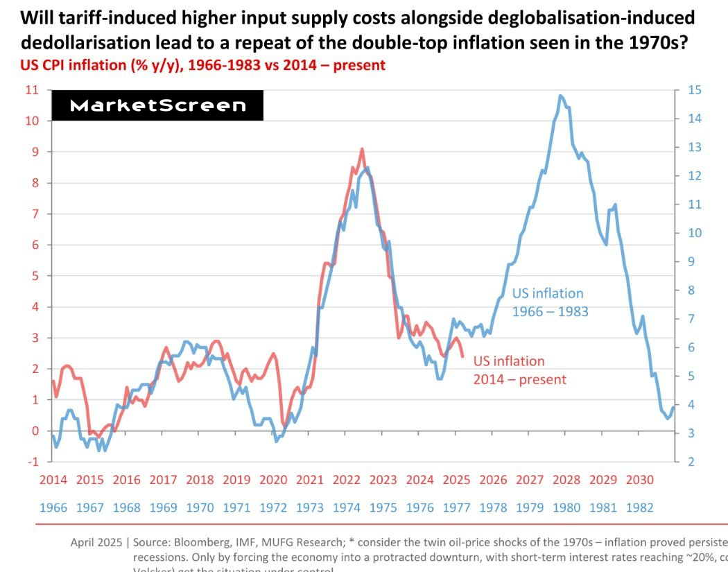 Напомню, импортные граждане нашли схожесть кривых, показывающих уровень американской инфляции в 1966-1983 и с 2014 по настоящее время. До текущего момента кривые практически идентичны. И вот все ждут, а будет ли так продолжаться и дальше? Ибо дальше на историческом участке 1966-1983 были лютый рост.