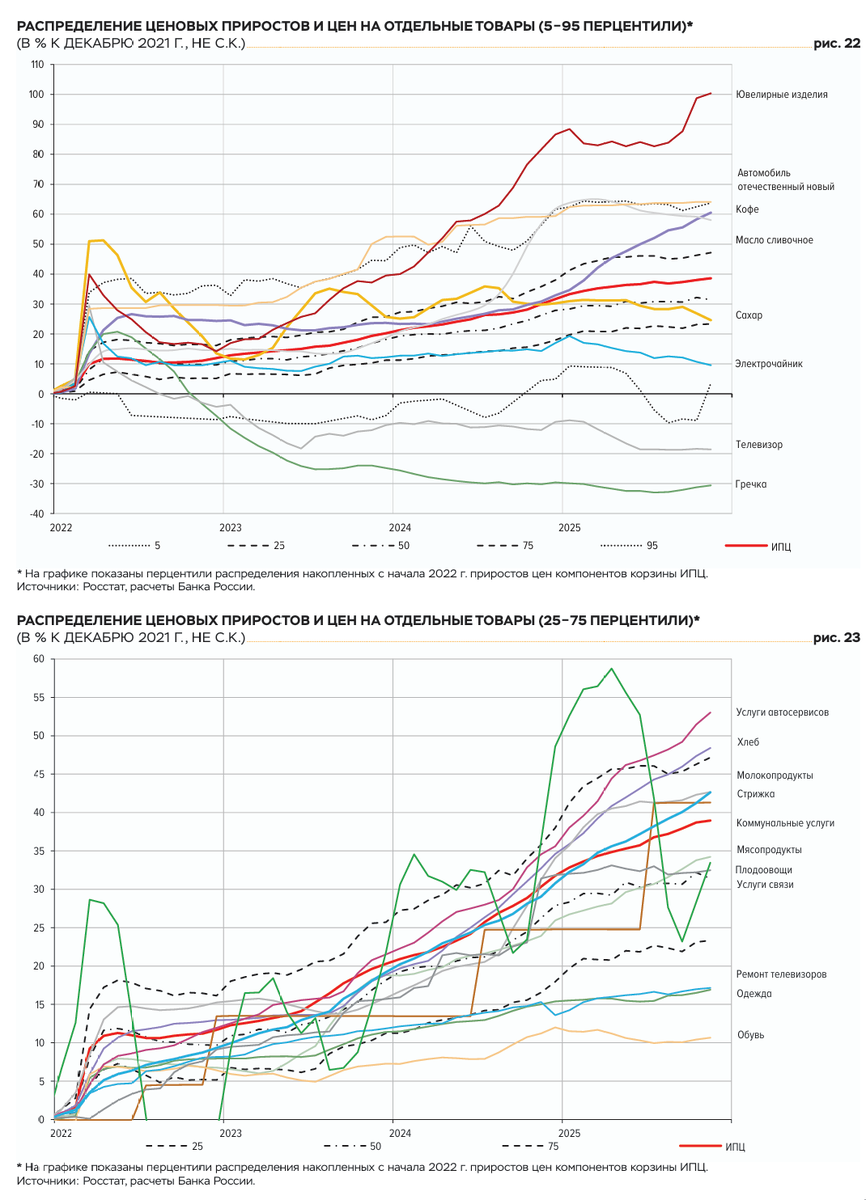 Сие есть распределение ценовых приростов и цен на отдельные товары в % к декабрю 2021 года. Пунктирными линиями показаны различные перцентили. Т.е. к примеру, 50 перцентиль означает, что половина товаров подорожала сильнее, а вторая половина меньше. Он находится в районе 32%. За 4 года.