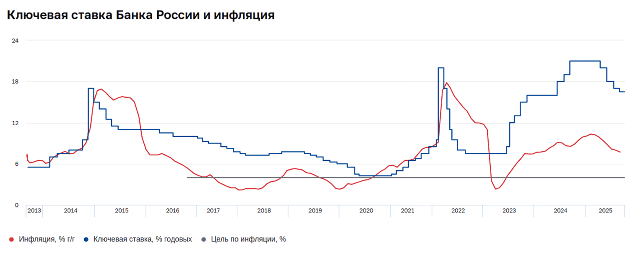 Графичек интересный. Сначала ставка поднимается, за ней инфляция ползет. Ставка опускается - инфляция вниз ползет. По времени - ставка определяет движение инфляции. Корреляция прослеживается?