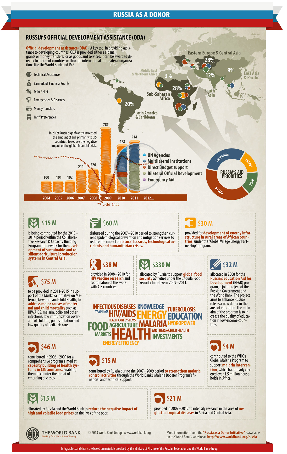 Объем официальной помощи России развитию неуклонно рос: с примерно 100 миллионов долларов в 2004 году до 1188 миллионов долларов в 2017 году . Последняя сумма включает в себя как двустороннюю, так и многостороннюю официальную помощь развитию, в том числе взносы через Группу Всемирного банка.