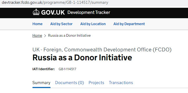 Попался недавно занятный грант на государственном сайте Великобритании. Он был направлен на поддержку России в ее роли как развивающегося донора. Идентификатор IATI: GB-1-114517 Финансирование шло через Министерство иностранных дел, по делам Содружества и развития (FCDO).
