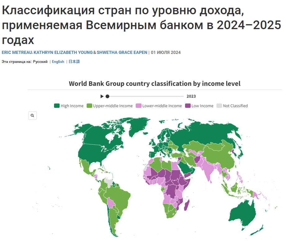 Всемирный банк публикует карту "Классификации стран по уровню дохода, применяемая Всемирным банком в 2024–2025 годах" .