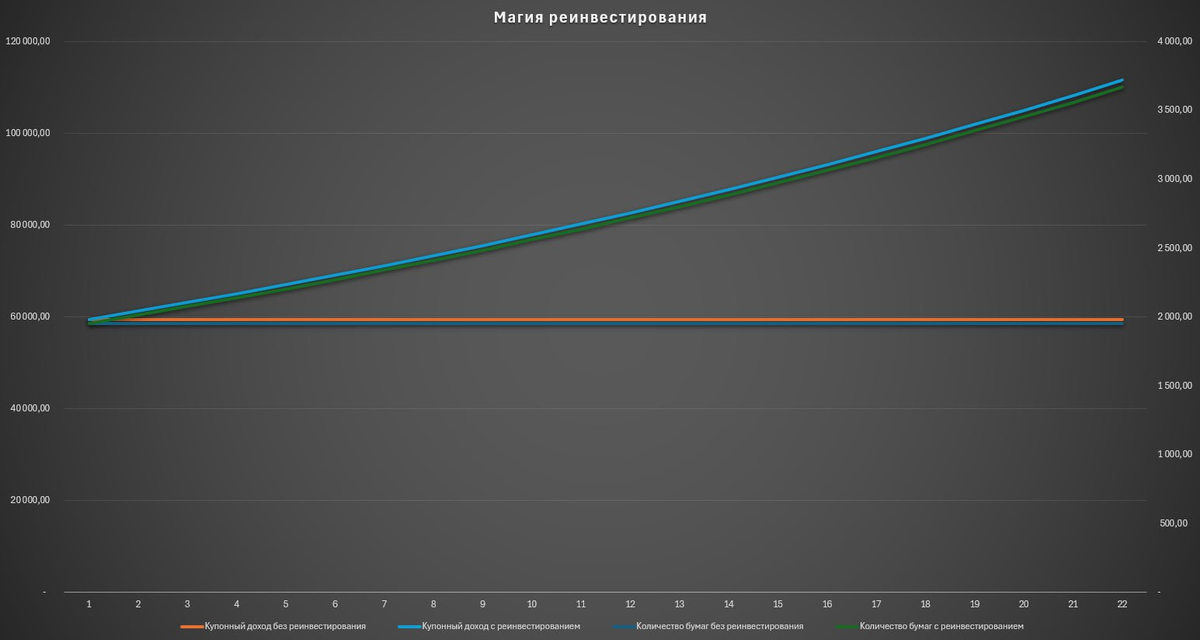 Если мы будем каждый раз купонные выплаты вкладывать в покупку новых бумаг, то к моменту гашения у нас на руках будет 3 666 шт. облигаций. А если не будем реинвестировать, то во владении у нас так и останется 1 954 штуки. Интересно? Еще бы! Ведь каждая приносит 30,42 ₽ дохода. Т.е. при последней купонной выплате мы получим 111 549 ₽ вместо 59 452 ₽.