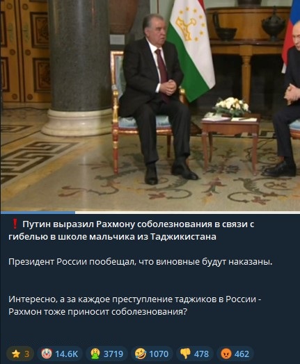 Я на прямой линии, Путину задала вопрос, ПОЧЕМУ все народы важны и нужны , кроме русского? Таджикистан, не принес извинений за резню русских в 90-е и наше руководство закрывает глазки, как будто этого не было(((( И так , во всем(