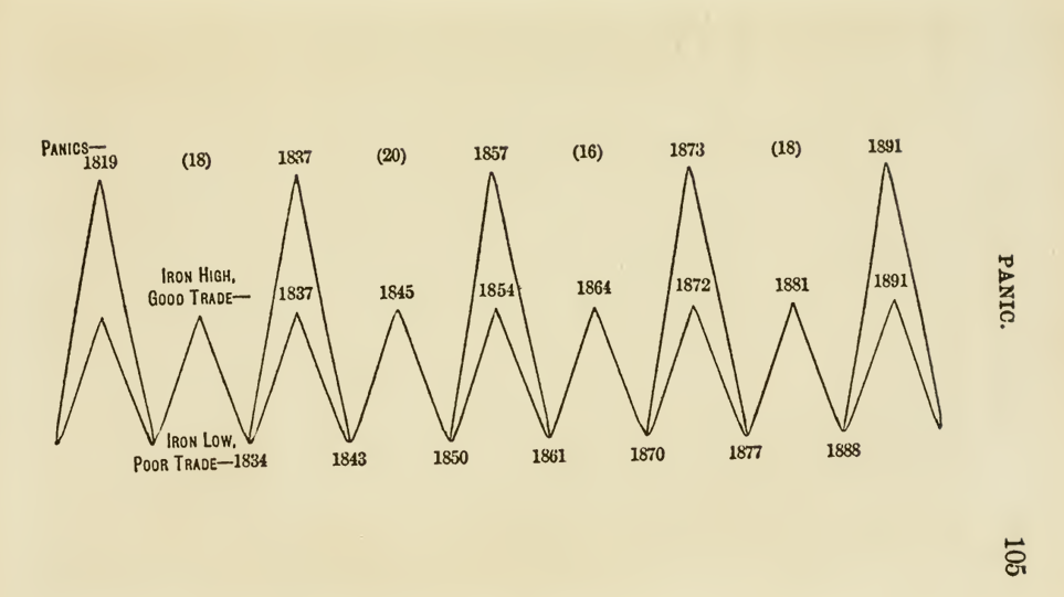 Сёма Беннар – это фермер из Огайи, разорившийся в 1873 году на рыночной панике. В поисках причины краха он придумал сам себе циклы. В 1876 году вышла книжка «Пророчества Беннера, или будущие взлёты и падения цен». В ней циклы были прописаны до конца 19 века (картинка №2). Очевидна, картина с более дальними сроками была добавлены в следующих изданиях или следующими поколениями. Путём экстраполяции.