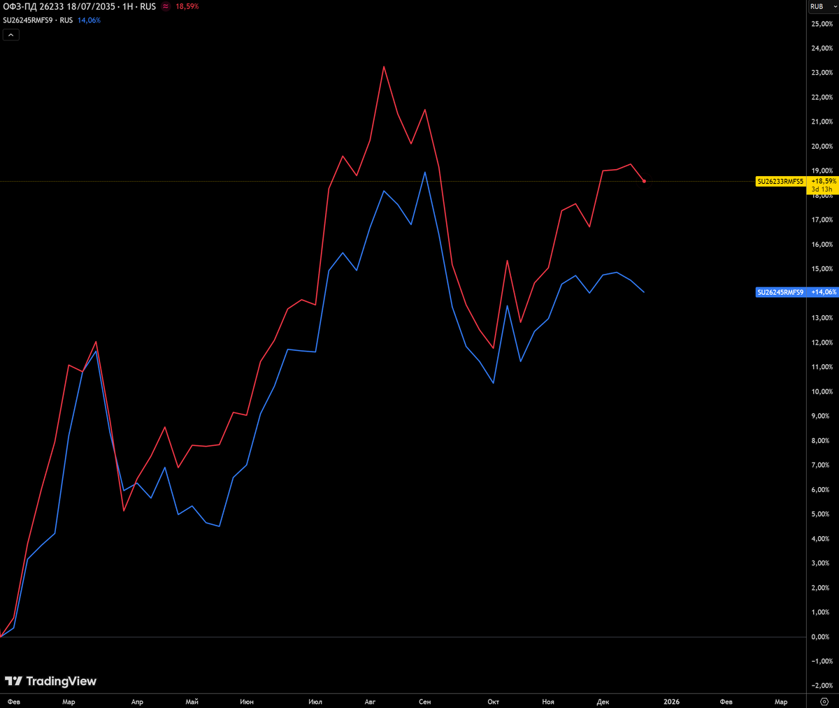 Тут что интересное всплыло. Тоже не все об этом задумываются. На картинке цены двух облигационных выпусков: ОФЗ 26245 (синий) и ОФЗ 26233 (красный). Ось Х процентная. Расчёт изменений идет с январского минимума. И вот 26245 прибавил с того момент 18,96%. А 26233 целых 23,27%. Откуда такая разница и почему мы сравниваем эти выпуски?