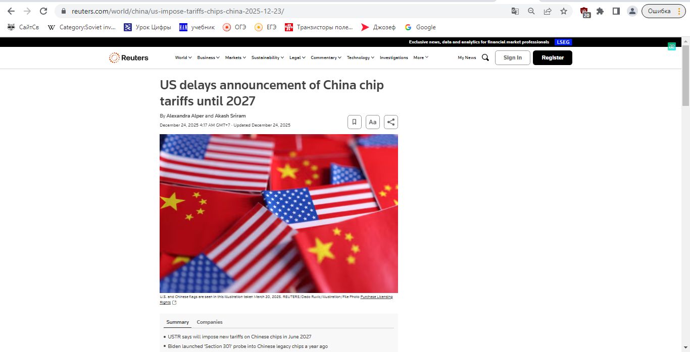США приняли решение о введении новых пошлин на китайские полупроводники, однако реальное применение этих мер отложено почти на два года. Как указано в официальных документах, тарифы вступят в силу только в июне 2027 года. Такое отложенное решение стало итогом многомесячного расследования в рамках так называемого раздела 301, которое началось ещё при администрации Джо Байдена и касалось недобросовестной, по мнению Вашингтона, торговли устаревшими чипами из Китая.