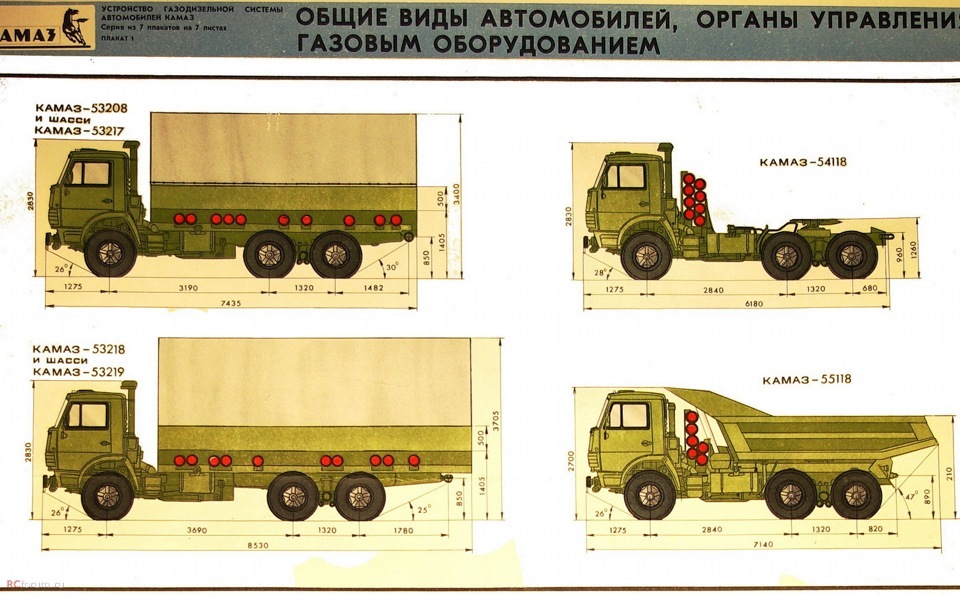 Первое поколение газодизельных грузовиков КАМАЗ включало следующие серийные модификации: бортовой грузовик КАМАЗ-53208 с нормальной колесной базой и его шасси КАМАЗ-53217, бортовой грузовик КАМАЗ-53218 с удлиненной колесной базой и его шасси КАМАЗ-53219, седельный тягач КАМАЗ-54118 и самосвал КАМАЗ-55118.