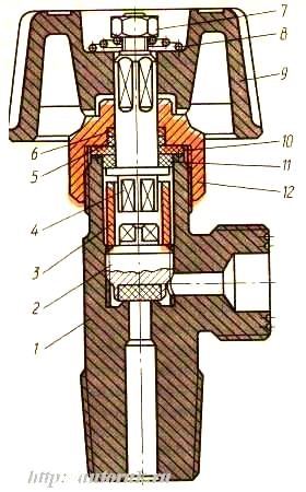 Вентили. Газобаллонная установка имеет четыре вентиля: два баллонных, наполнительный и расходный (магистральный). Баллонные вентили служат для подключения секций баллонов к общей магистрали. Наполнительный вентиль предназначен для заправки баллонов сжатым газом. Штуцер наполнительного вентиля имеет специальную левую резьбу и закрыт заглушкой, предохраняющей от попадания на него грязи и влаги. На других вентилях штуцера с правой резьбой. Для подсоединения газопроводов на этот штуцер устанавливается переходник, уплотняемый прокладкой. В остальном все вентили устроены одинаково, их конструкция показана на рисунке.