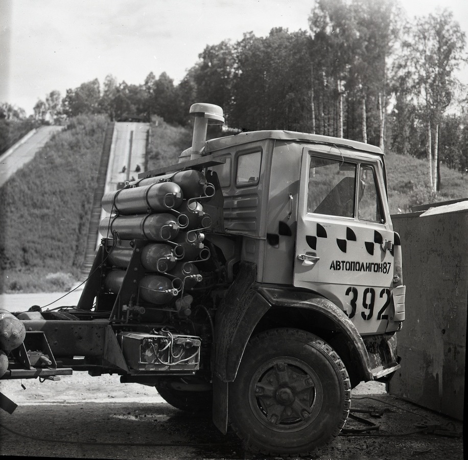 Грузовик КАМАЗ-53218 после испытательного переворота с косогора. Несмотря на повреждение грузовой платформы крепление газовых баллонов сохранилось в штатном режиме