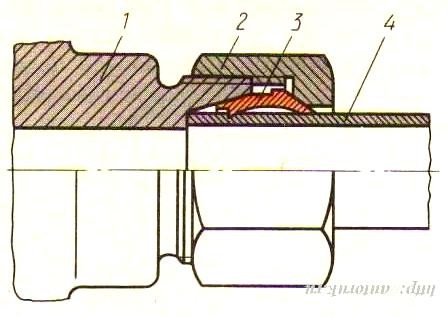 Ниппельное соединение допускает многократную разборку. При установке нового ниппеля необходимо следить за тем, чтобы он находился на расстоянии около 1,5… 2 мм от конца трубки. При затягивании накидной гайки 2 ниппель 3 деформируется и принимает форму внутреннего конического отверстия в штуцере, обеспечивая герметичность соединения. Одновременно ниппель врезается острой кромкой в стенки трубки, препятствуя ее вырыву из соединения под действием высокого давления. Усилие затяжки накидной гайки в процессе предварительного врезания кольца должно составлять 40…56 Н. Ниппель должен быть плотно посажен на трубке. Если после затяжки гайки ниппель не обеспечивает герметичность соединения, то его следует заменить совместно с газопроводом. Предварительная пайка ниппеля припоем и развальцовка концов трубок не допускаются.