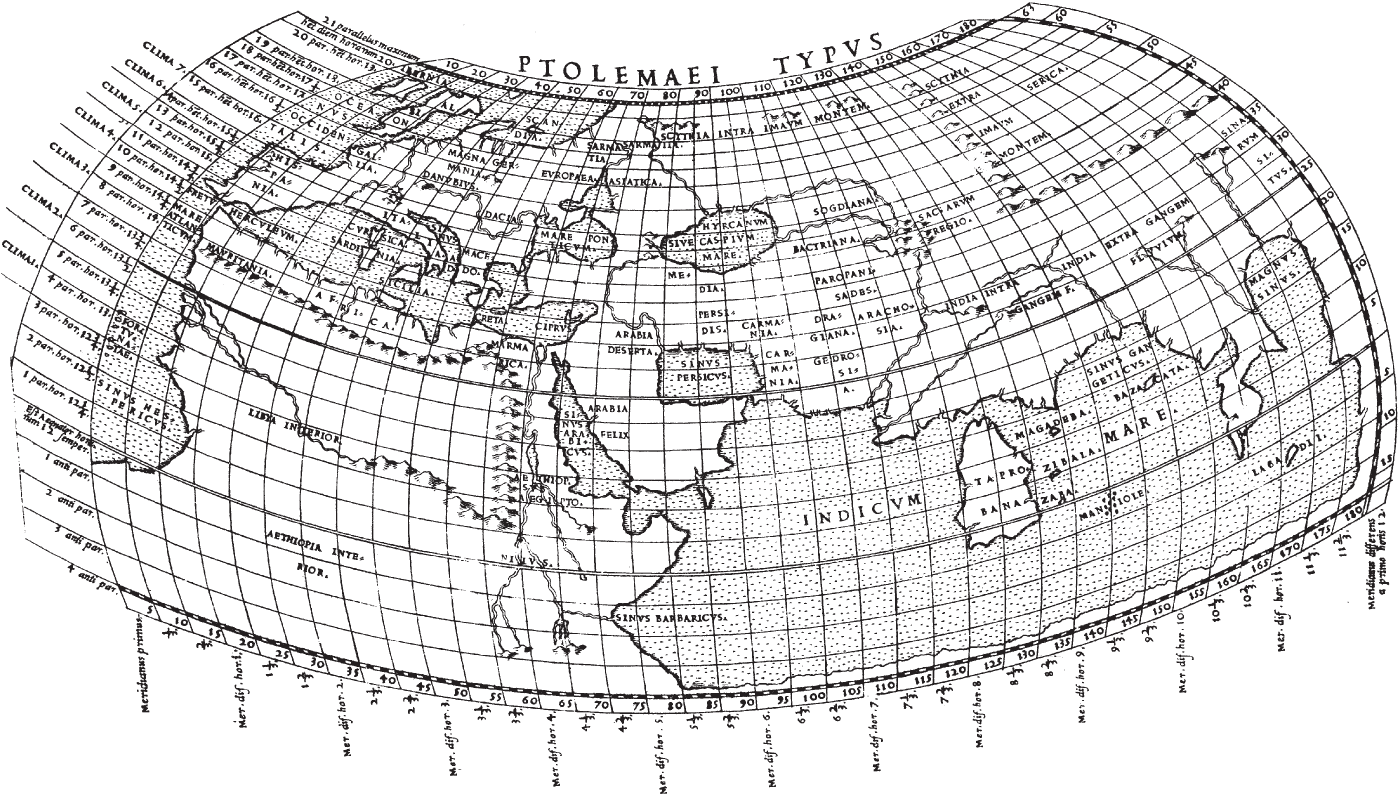 В своем фундаментальном труде «Руководство по географии» Клавдий Птолемей систематизировал и указал координаты около 8000 объектов. Несмотря на относительную точность данных о ключевых регионах, периферийные области наносились им лишь приблизительно. По мнению Птолемея, практически единственное, что можно было сделать, это нанести их на карту как можно точнее по отношению к хорошо известным местам. Результат подобной практики можно видеть на многочисленных реконструкциях его карты.