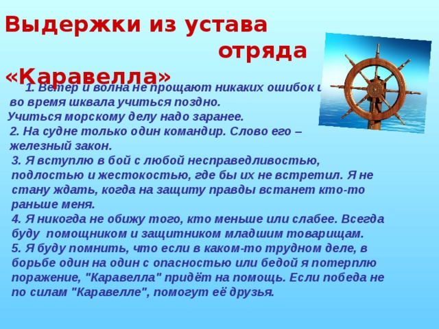 Хочется разместить оригинальные (созданные ещё в Советском Союзе) правила отряда "Каравелла", учили их ребята наизусть и декламировали в строю как присягу.