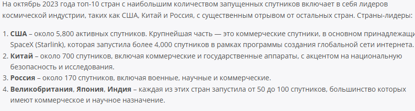 У нас сейчас спутников больше, чем у Китая в полтора раза, но да, меньше, чем у пиндостана в 9 раз, но - из 11k спутников у Америки 8,5k - старлинковская мелочёвка Маска, который закидывает их десятками через день.