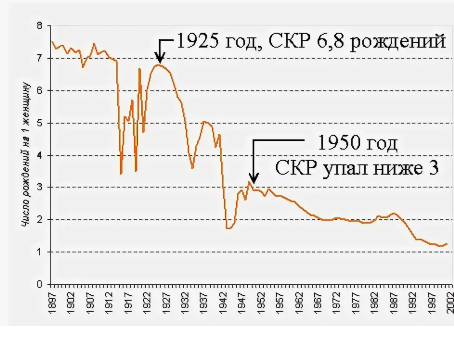 Резкое падение СКР в 20-30 годы, время бурного развития и урбанизации, как во всем мире. А аборты падали, наверное, с ростом доступности контрацепции.