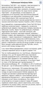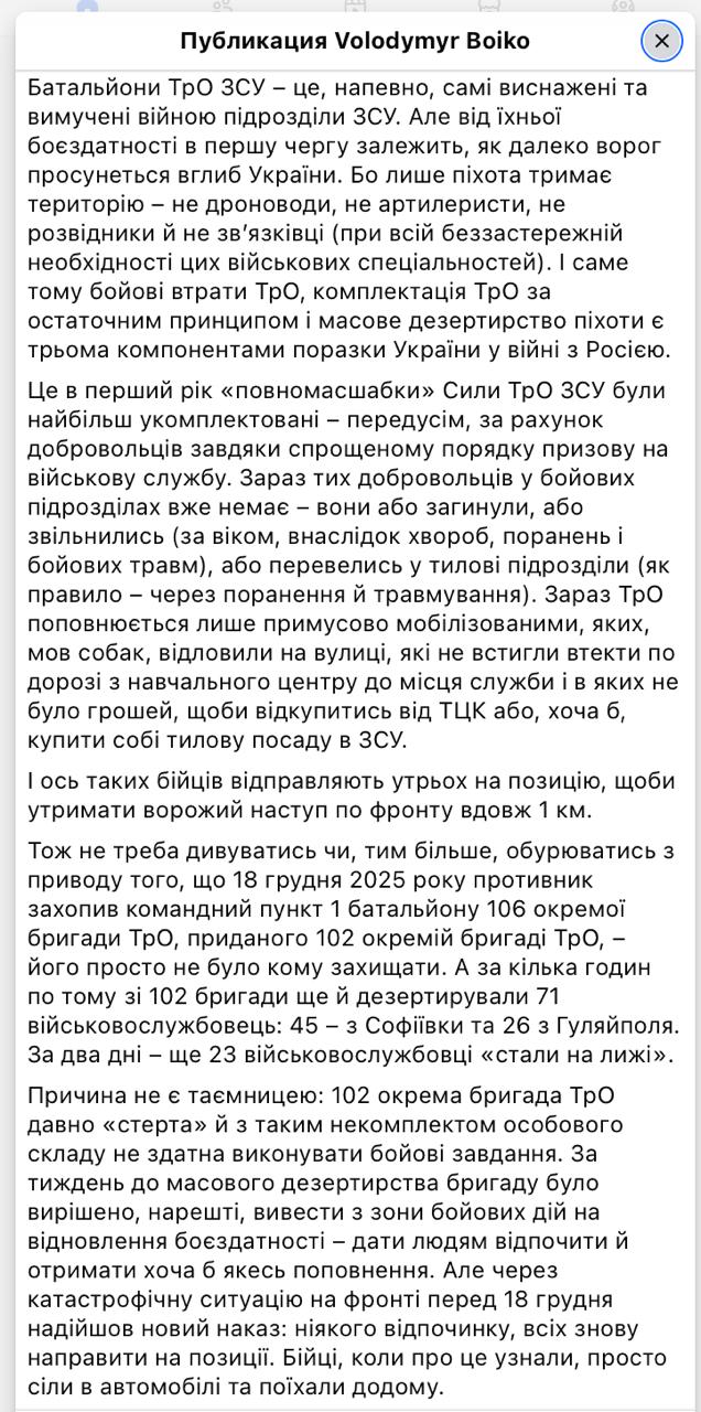 Поэтому не нужно удивляться или, тем более, возмущаться по поводу того, что 18 декабря 2025 года противник захватил командный пункт 1 батальона 106 отдельной бригады ТрО, приданного 102 отдельной бригаде ТрО, - его просто некому было защищать. А несколько часов спустя из 102 бригады еще и дезертировали 71 военнослужащий: 45 - из Софиевки и 26-из Гуляйполя. За два дня - еще 23 военнослужащих «встали на лыжи».