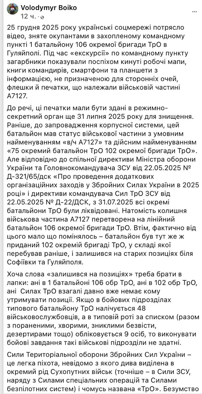 25 декабря 2025 года украинские соцсети потрясло видео, снятое русскими в захваченном командном пункте 1 батальона 106 отдельной бригады ТрО в Гуляйполе. Во время «экскурсии» по командному пункту захватчики показывали спешно брошенные рабочие карты, книги командиров, смартфоны и планшеты с информацией, не предназначенной для посторонних глаз, флешки и печати, принадлежавшие воинской части A7127.