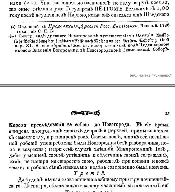 …На следующее утро, а именно 28 июля, мы наконец въехали в Великий Новгород. Некоторые из нашего люду, которые, как выше сказано, были посланы вперед по санному пути, и уже более 4 месяцев с нетерпением ждали нашего прибытия, от сильной радости выехали на лодке больше чем за милю навстречу нам. Воевода, для привета нам, прислал в гостиницу бочку пива, меду и бочонок водки. В виде обратного подарка ему был послан серебряный позолоченный прибор для питья. Мы оставались в Новгороде в бездействии четверо суток и в последнее число июля, к вечеру, отправились дальше до Бронниц 39 водою, так как, из-за болотистой, топкой местности, невозможно было ехать сушею…(5, с.40).