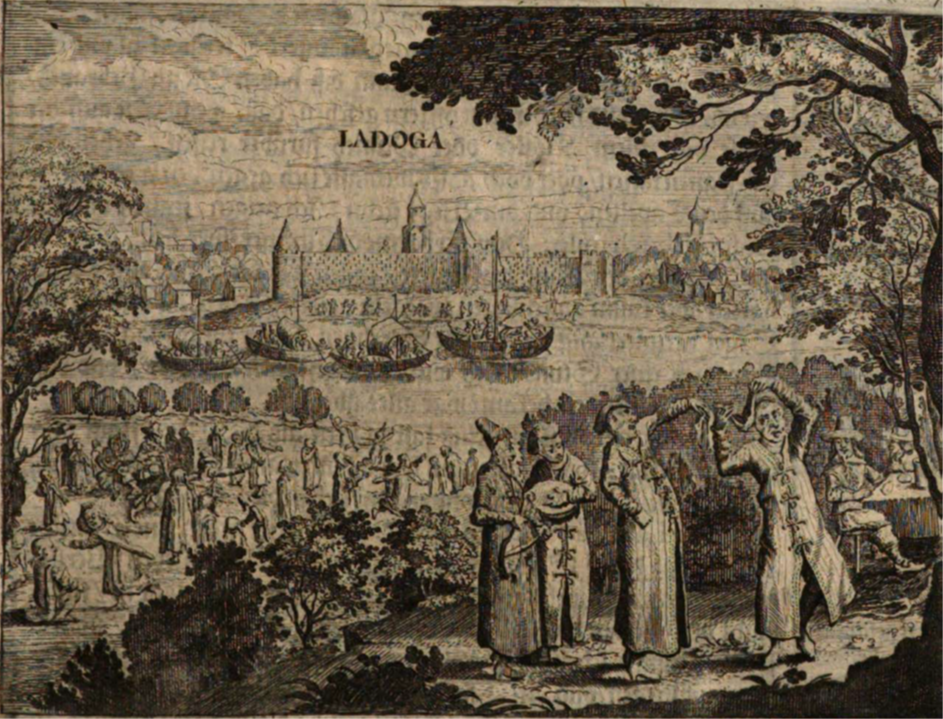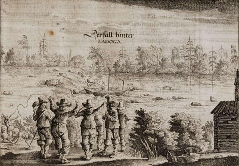 …В семи верстах от Ладоги (пять верст составляют одну немецкую милю) на этой реке пороги, и еще через семь верст другие, через которые очень опасно переезжать в лодках, так как там река стрелою мчится вниз с больших камней и между ними. Поэтому, когда мы прибыли к первым порогам, то вышли из лодок и пошли берегом, дожидаясь, пока наши лодки сотнею людей перетаскивались через пороги на канатах. Однако все прошли счастливо, за исключением последней, в которой мы должны были оставить Симона Фризе, купеческого сына из Гамбурга, ввиду сильной болезни, которою он страдал. Когда эта лодка сильнее всего боролась с течением, вдруг разорвался канат, и она стрелою помчалась назад. Она, вероятно, достигла бы опять порогов, через которые ее с трудом перетащили, и, без сомнения, разбилась бы тут, если бы, по особому счастию, канат, значительный обрывок которого еще остался на лодке, не закинулся случайно за большой выдававшийся из воды камень, зацепившись за него с такой силою, что только с трудом можно было опять отвязать его. Нам сообщили, что на этом самом месте несколько ранее засело судно некоего епископа, нагруженное рыбою, и погибло вместе с епископом. Через другие пороги, которые не так опасны, мы прошли к вечеру…(5, с.36-37).