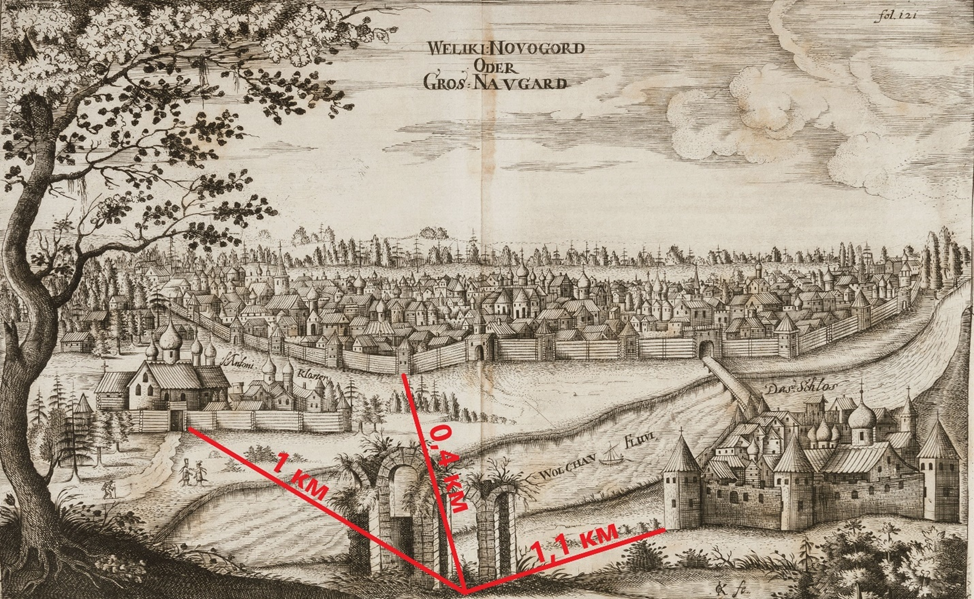 То есть, на рисунке Новгорода Олеарий существенно исказил реальные расстояния и пропорции. Однако, на других рисунках Олеария таких искажений не наблюдается. Если сравнивать рисунки Олеария других русских городов и крепостей, сделанных Олеарием по его маршруту из Нарвы в Новгород и Москву в 1634 году с реконструкциями историков или современными фотографиями этих крепостей (16, с.161, 205; 17;1), то в целом Олеарий нарисовал их правильно.