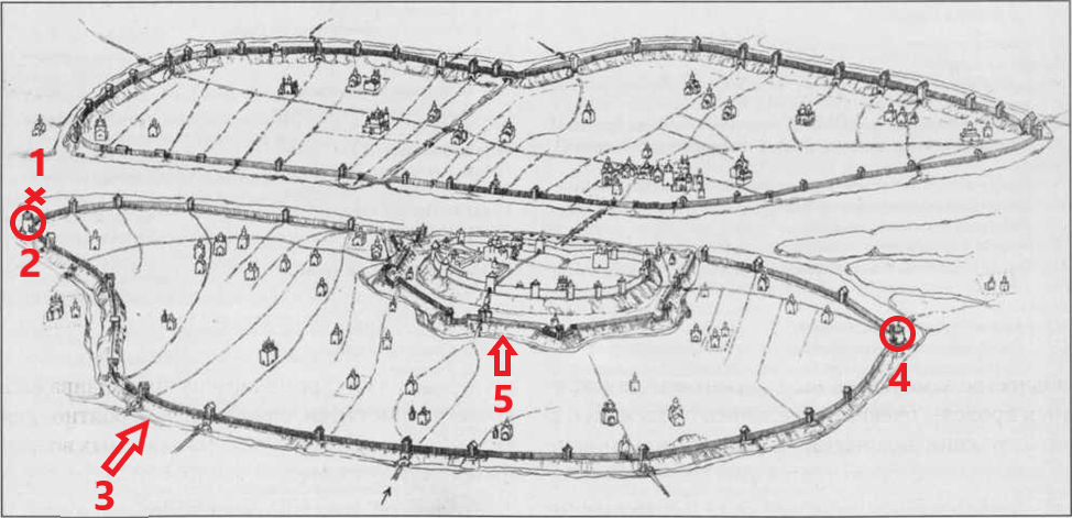 Рис. 14. Реконструкция крепостных сооружений Новгорода на конец XVI в.: 1 – точка, с которой по мнению В.Л. Янина был сделан рисунок Олеария, 2 – Петровская башня, 3 – Вал Окольного города, 4 – Алексеевская башня, 5 – Земляной город (15, 108-110).