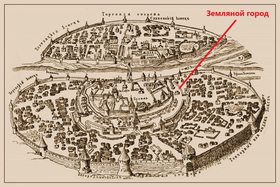 Считается, что в это время Земляной город Новгорода включал в себя ров шириной 20-30 метров, бревенчатую стену высотой 4 метра и длиной 2 км и 9 деревянных башен высотой 8–10 метров (1;15, с.108 – 110; 18). С 1632 года Земляной город существенно не перестраивался.