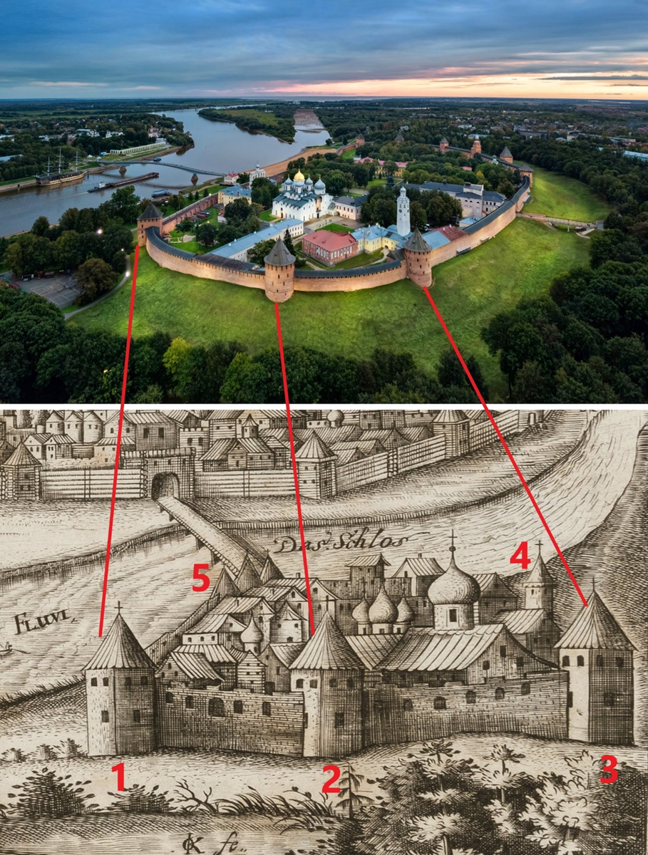 Рис.16. Кремль В. Новгорода сегодня (19) и на рисунке А. Олеария 1636 года (12). Башни: 1 – Владимирская, 2 – Федоровская, 3 – Митрополичья, 4 – ?, 5 – Пречистенская (1).