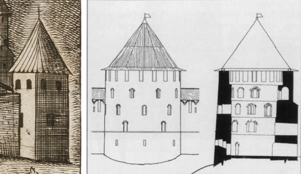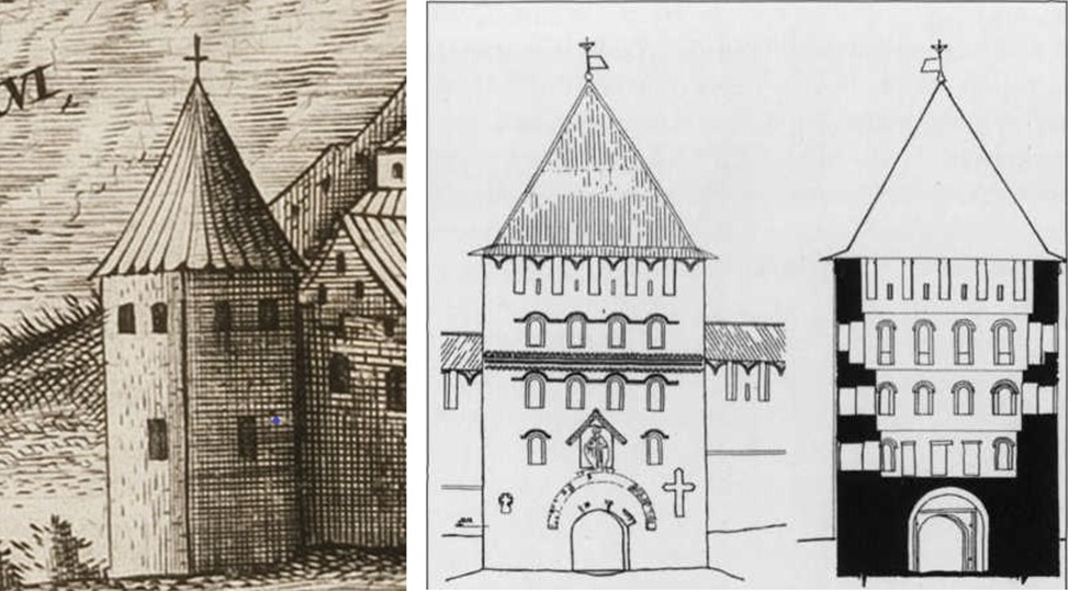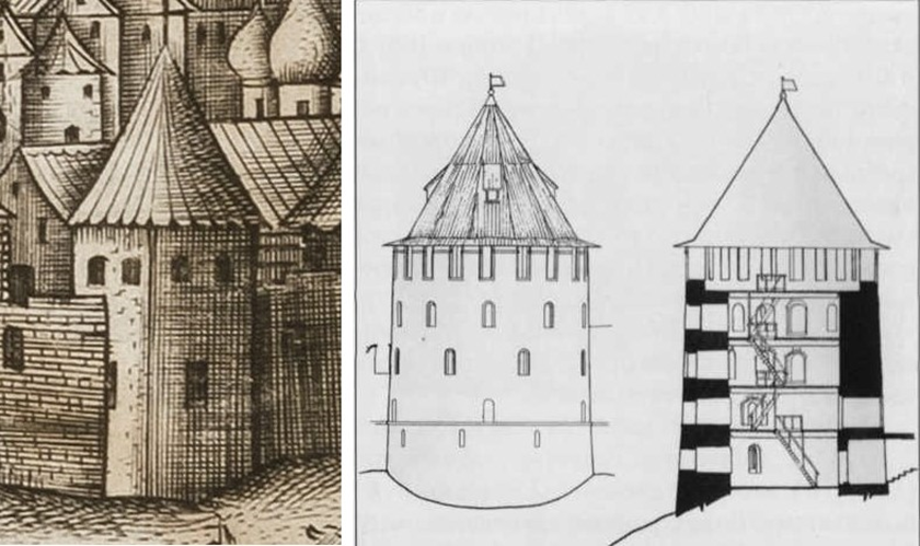 Рис.18. Федоровская башня Новгородского Кремля на рисунке Олеария 1636 года (12) и по реконструкции историков (15, с.91).