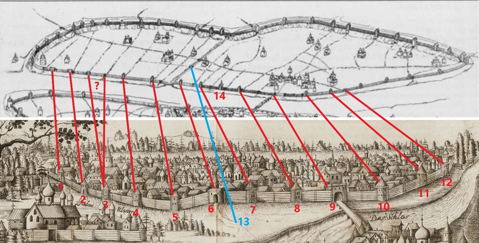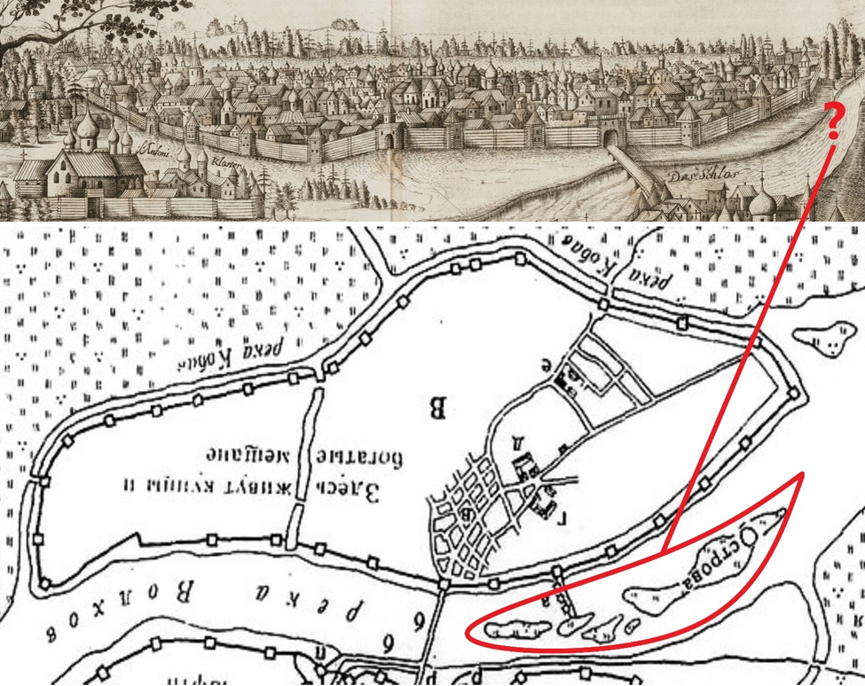 19. Переделкой крепости Пскова на рисунке Олеария под Новгород, вероятно, и объясняется совершенно невероятное для ответственного секретаря посольства, ученого, математика, физика и астронома Олеария количество ошибок и искажений, допущенных им на рисунке Новгорода.