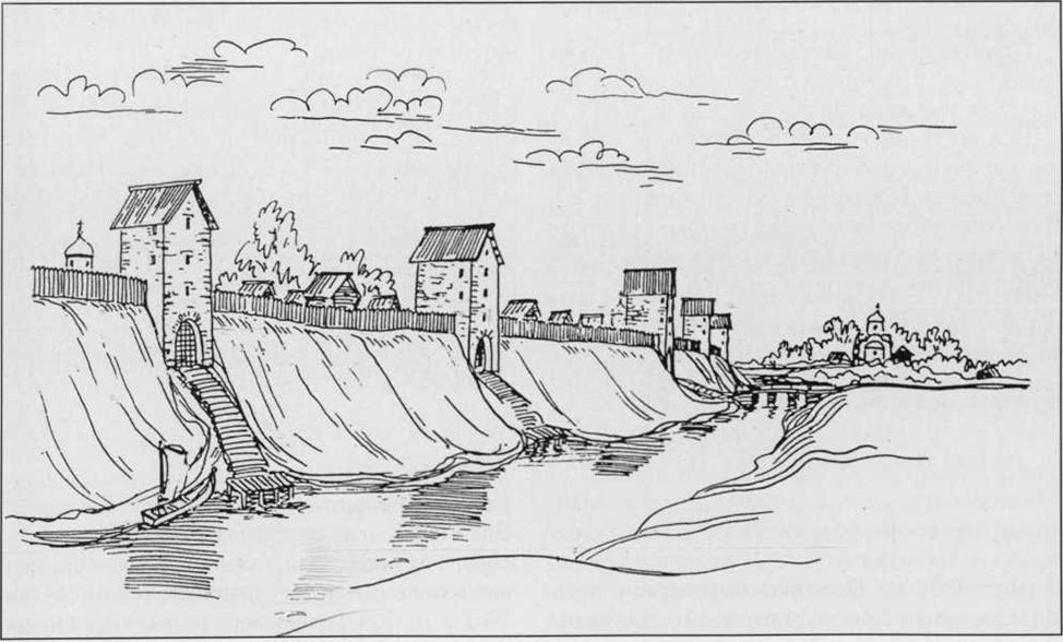 14. Рисунок Новгорода, сделанный Олеарием, - это отредактированный рисунок Пскова, через который Олеарий проезжал в 1636 году. Изначально главным сюжетом рисунка была Псковская крепость, которая после переделки «стала» Окольным городом Торговой стороны Новгорода (рис.38). При этом в рисунок был перенесен летний пейзаж с уничтоженного рисунка того Новгорода, через который Олеарий проезжал в июле 1634 года.