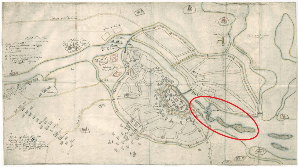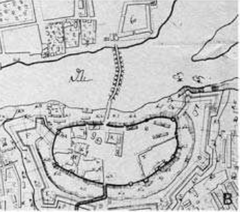 Рис. 15. Земляной город на плане Новгорода, реконструированном по «описи 1675 года» (1).