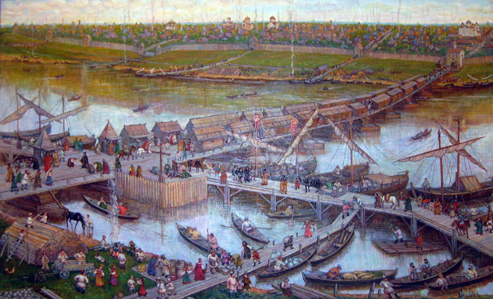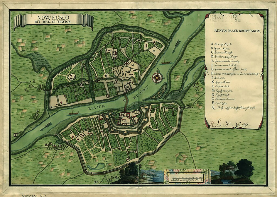 Олеарий отмечает удобство расположения Новгорода для торговли по реке Волхов.