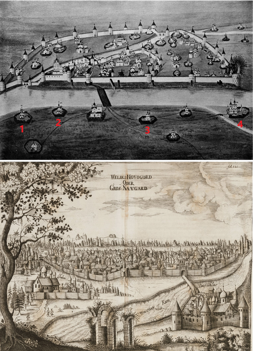 17. Защитных сооружений в Завеличье, откуда, вероятно, и рисовал Псковскую крепость Олеарий, не было. Поэтому, ни остатков Окольного города Софийской стороны, ни Земляного города на рисунке Новгорода нет.