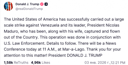 Эта операция была проведена совместно с правоохранительными органами США. Подробности последуют. Сегодня в 11:00 в Мар-а-Лаго состоится пресс-конференция. Благодарим вас за внимание к этому вопросу! Президент Дональд Трамп.