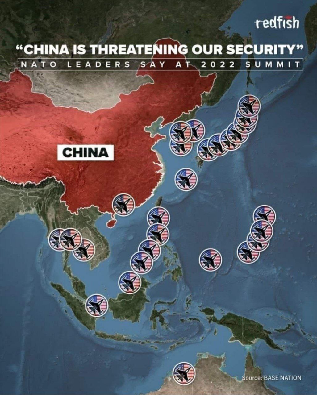 Там кольцо друзей: Япония, Южная Корея, Филлипины, Тайвань и другие. Эти страны не только не союзники Китая, но имеют американские базы на своей территории, плюс чисто американские базы Гуама. Там характер размещения немного другой, чем у нас со стороны Европы и юга, но всё равно много против чего размещено.
