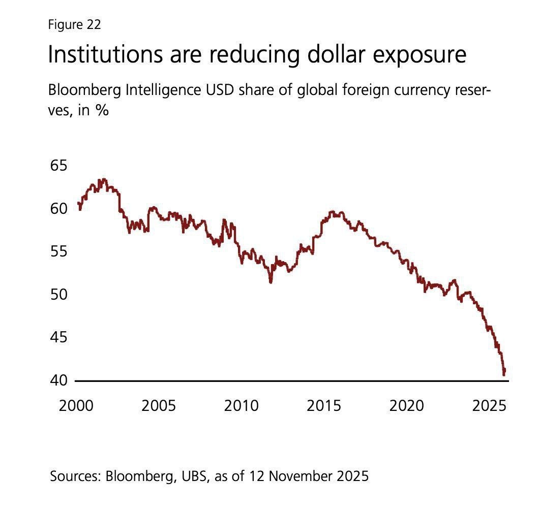 За последние 25 лет использование доллара США в качестве валютных резервов снизилось с 61% до 41%. Индекс доллара США упал на 9% в 2025 году, показав худший результат с 2017 года