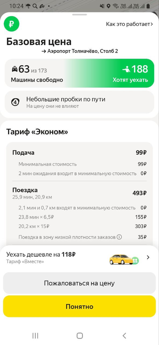 Специально для Вас Яндекс.Го сделал(а) карточку формирования цены. Где указано, сколько машин на линии, сколько из них свободны. И сколько имеется юнитов, желающих воспользоваться услугами самоходной повозки.