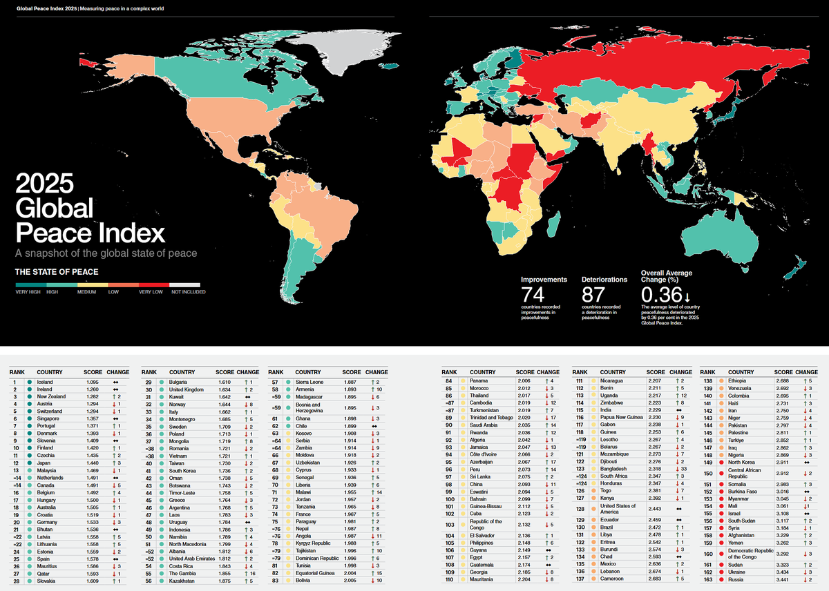 Индекс, который ранжирует 163 государства в соответствии с уровнем их миролюбия. Индекс, разработанный Институтом экономики и мира (IEP), является ведущим мировым показателем глобального миролюбия.