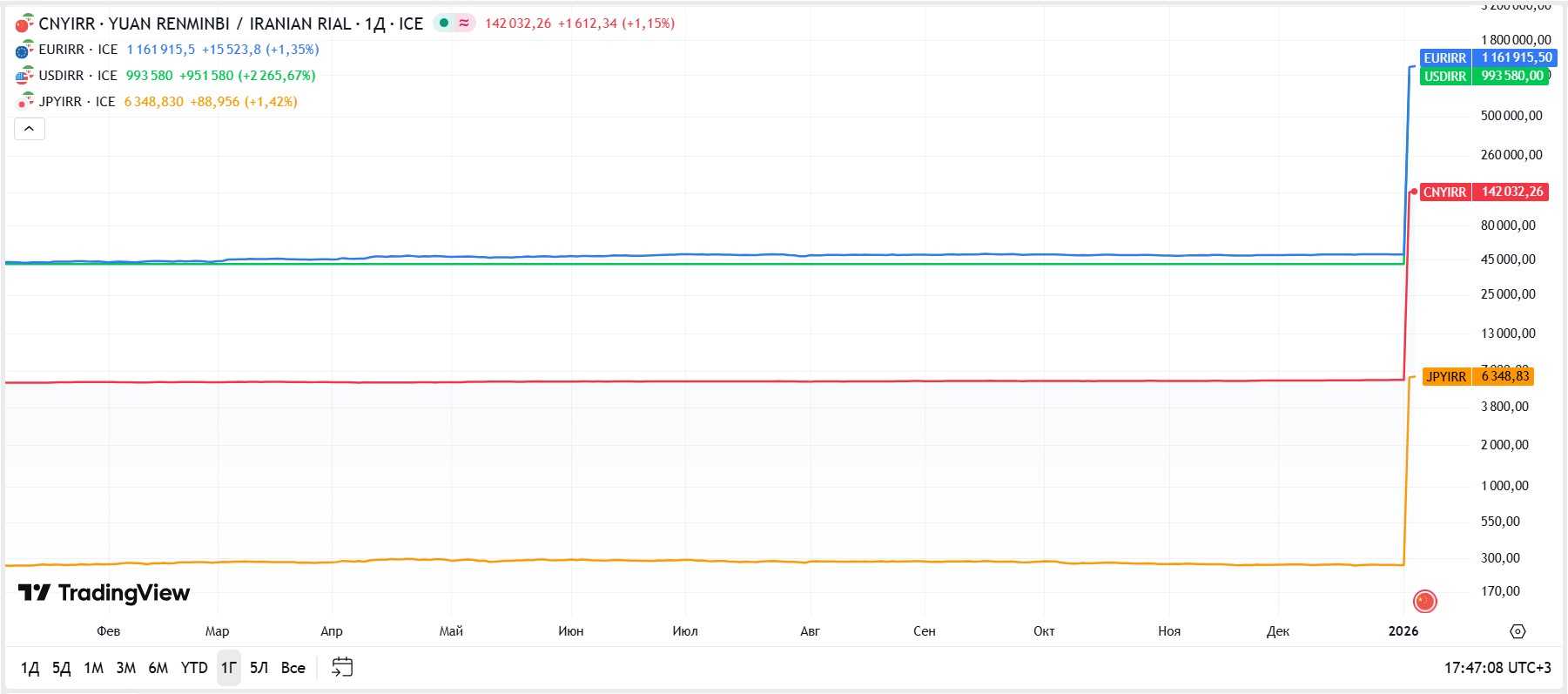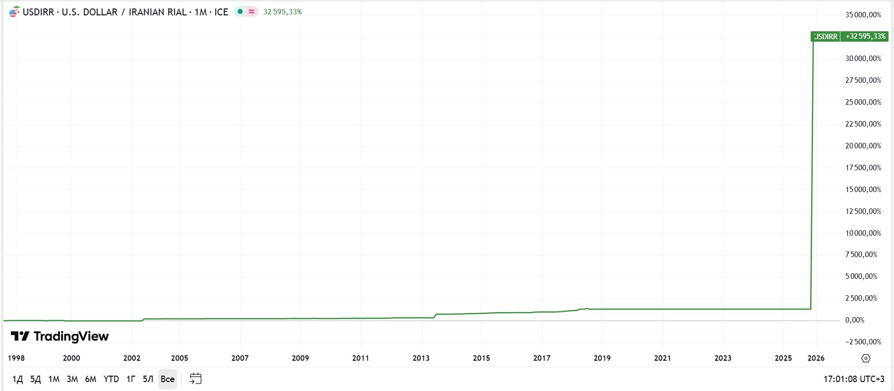 В тизере курс доллара к иранскому риалу, но шкала времени там сдвинута произвольно, чтобы отчетливее показать, что же у них случилось. Как видно, до декабря 2025 доллар и так дорожал, но... не так резко, как это случилось следом, с 1 (поправка) с 6-го января 2026. Скрин ниже уже за все время и автоматически масштабируется, учитывайте также, что это курс официальный, а есть еще и теневой рынок.