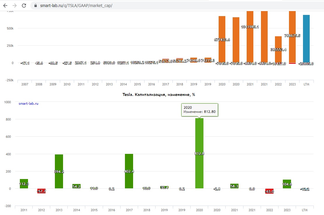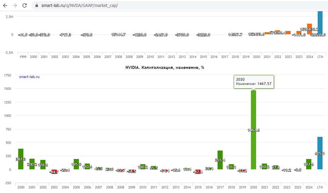 · 2021: январь – по итогам 2020 капитализация TESLA выросла на 812,8% и достигла 668,9 млрд $, капитализация NVIDIA – на 1467% и достигла 726 млрд $ соответственно. В данном случае взято финальное значение на конец года.
