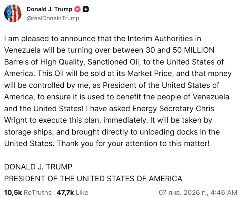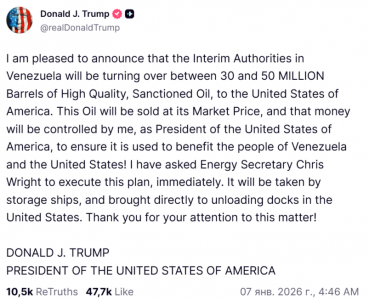 С радостью сообщаю, что временные власти Венесуэлы передадут Соединенным Штатам Америки от 30 до 50 миллионов баррелей высококачественной, разрешенной к использованию нефти. Эта нефть будет продаваться по рыночной цене, и я, как президент Соединенных Штатов Америки, буду контролировать эти средства, чтобы гарантировать, что они будут использованы на благо народа Венесуэлы и Соединенных Штатов! Я поручил министру энергетики Крису Райту немедленно приступить к реализации этого плана. Нефть будет доставлена на судах-хранилищах непосредственно на разгрузочные причалы в Соединенных Штатах. Благодарю вас за внимание к этому вопросу!