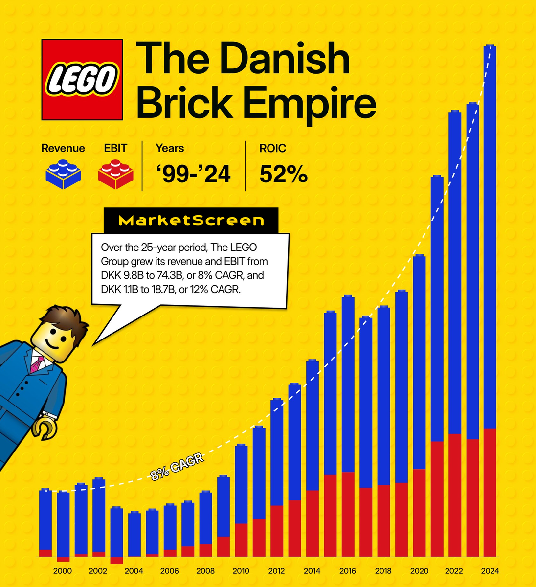 Несмотря на это, компания вот уже более двух десятилетий публикует свой годовой отчёт. Это может показаться несколько необычным для частной закрытой компании, но для крупных скандинавских компаний это не редкость. Читая годовые отчеты LEGO, можно воочию увидеть невероятно хорошо управляемый и успешный бизнес. Об этом можно говорить много, но лучше всего это видно на примере среднего годового роста выручки LEGO Group, который составляет 8% за 25 лет: