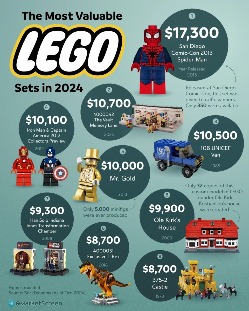 Cамые ценные наборы LEGO на сегодняшний день, включая как розничные, так и специальные коллекционные наборы. Список был составлен Brick Economy по состоянию на октябрь 2024 года.