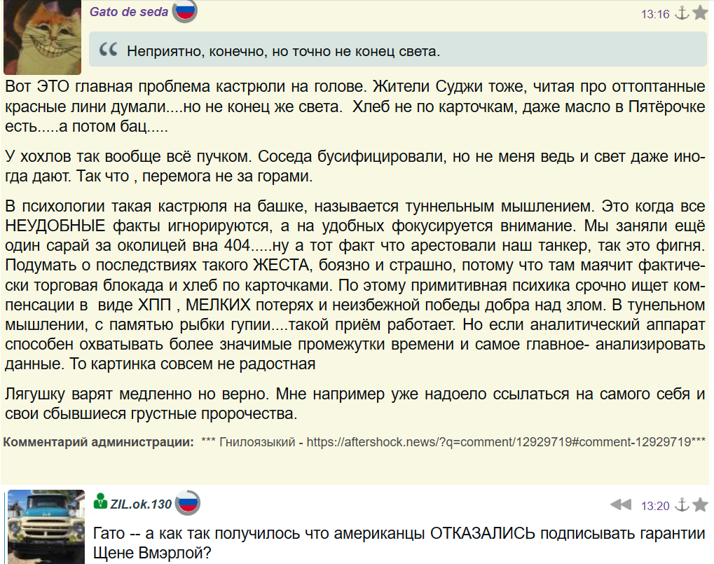 В психологии такая кастрюля на башке, называется туннельным мышлением. Это когда все НЕУДОБНЫЕ факты игнорируются, а на удобных фокусируется внимание. Мы заняли ещё один сарай за околицей вна 404.....ну а тот факт что арестовали наш танкер, так это фигня. Подумать о последствиях такого ЖЕСТА, боязно и страшно, потому что там маячит фактически торговая блокада и хлеб по карточками. По этому примитивная психика срочно ищет компенсации в виде ХПП , МЕЛКИХ потерях и неизбежной победы добра над злом. В тунельном мышлении, с памятью рыбки гупии....такой приём работает. Но если аналитический аппарат способен охватывать более значимые промежутки времени и самое главное- анализировать данные. То картинка совсем не радостная