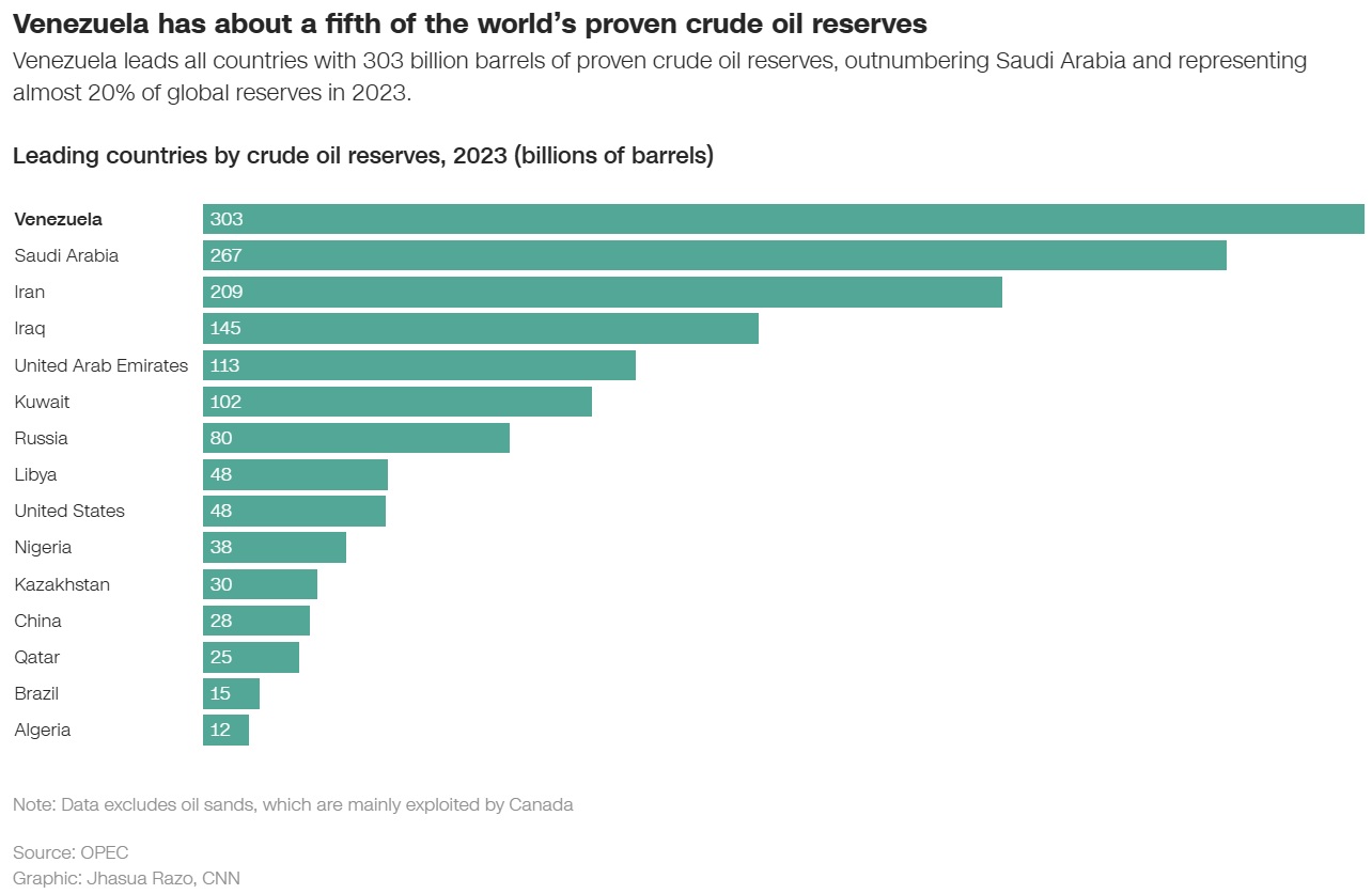 Согласно федеральным оценкам, Венесуэла обладает большими доказанными запасами нефти, чем любая другая страна на планете — она имеет запасы больше, чем Ирак, Россия и Соединенные Штаты вместе взятые.