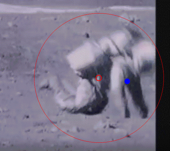 Несмотря на то, что выбранные кадры не сняты строго с бокового ракурса, очевидно, что центр вращения находится примерно там же, где и "центр масс" астронавта без "чемодана" PLSS,